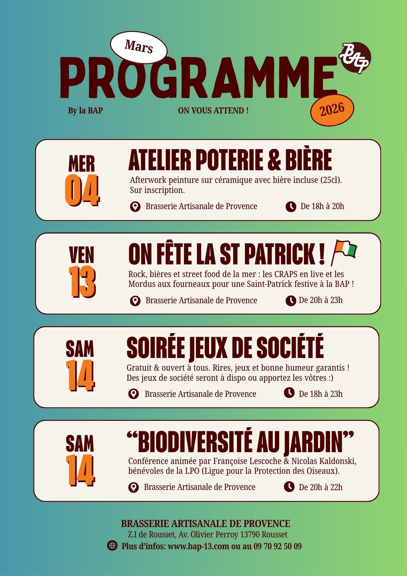 - Vendredi 13 mars : ON FÊTE LA ST PATRICK ! Rock, bières et street food de la mer : les CRAPS en live et les Mordus aux fourneaux pour une Saint-Patrick festive à la BAP de 20h à 23h
